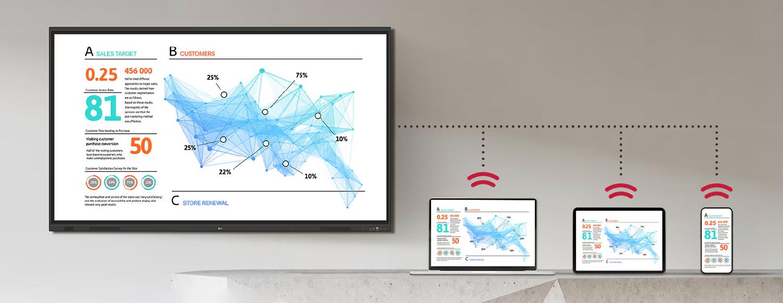 LG CreateBoard Share: LG CreateBoard Share cung cấp tính năng chia sẻ màn hình không dây (lên đến 9 màn hình), mang đến cho người dùng môi trường thảo luận linh hoạt. Người dùng có thể chia sẻ màn hình của mình từ PC, máy tính bảng hoặc điện thoại thông minh, đơn giản hóa quy trình chia sẻ và cộng tác trong các dự án nhóm hoặc tài liệu thuyết trình.
